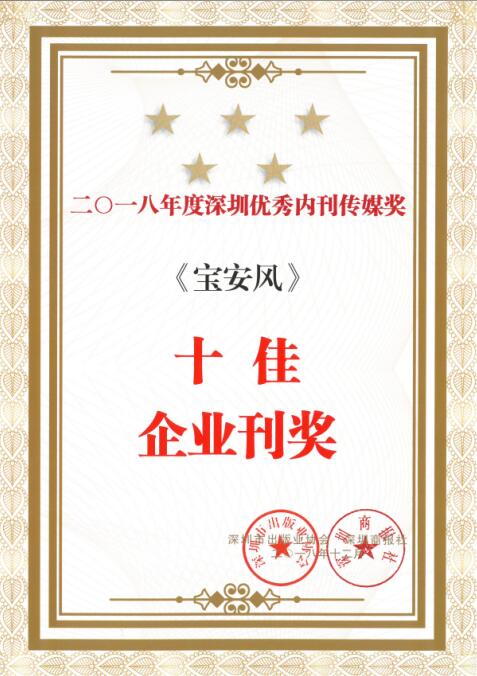 12月14日, 2018深圳内刊界总结交流大会暨“优秀内刊传媒奖”表彰大会召开,集团内刊《宝安风》在四百多家企业内刊中脱颖而出,再度获评“十佳企业刊奖”,同时斩获“优秀经济专题”等3个单项奖。
