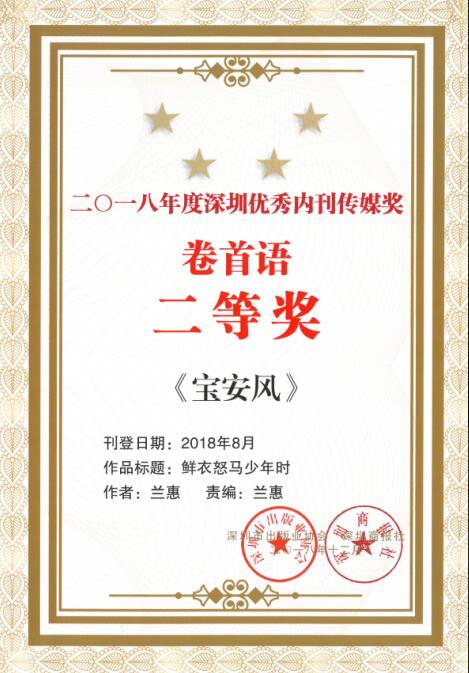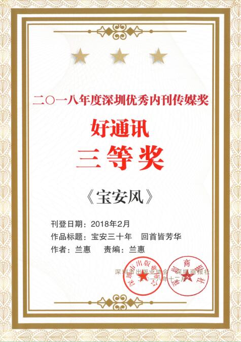 深圳内刊年度综合奖“优秀内刊传媒奖”,由市出版业协会、深圳商报联合组织深圳市新闻出版广电局等资深文化传媒专家评定,每年评选一次,代表着深圳内刊的最高荣誉。《宝安风》在强手林立的深圳内刊界再接再厉,再次获评“深圳优秀内刊传媒奖”之“十佳企业刊奖”。同时,282期“精益人才专题”获“经济专题”三等奖,286期卷首《鲜衣怒马少年时》获评“卷首语”二等奖,283期通讯“宝安三十年 回首皆芳华”获评“好通讯”三等奖。